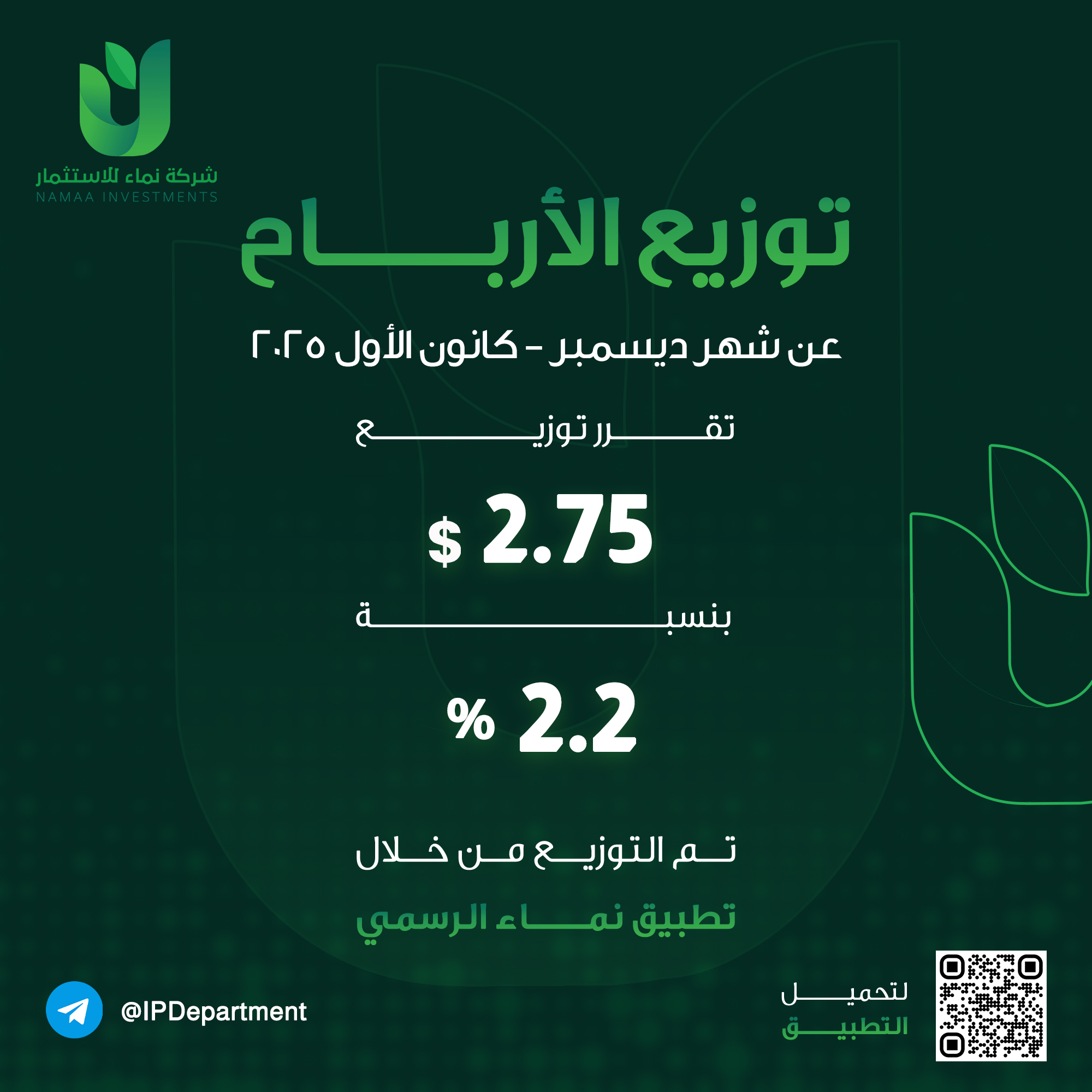 بفضلٍ من الله تعالى، بلغَ صافي أرباح شركة نـمـاء للاستثمار وشركاتِها التابعة عن شهر كانون الاول (ديسمبر) للعام الحالي 2025م نحو 1,465,200$ (مليون وأربعمائة وخمسة وستون ألفاً ومئتا دولار أمريكي). وعليه، قرَّر مجلسُ إدارةِ الشركة توزيع 2.75$ للسهمِ الواحدِ (دولاران أمريكيان وخمسة وسبعون سنتاً)، بنسبة 2.2%من القيمة الاسمية للسهم البالغة 125$.