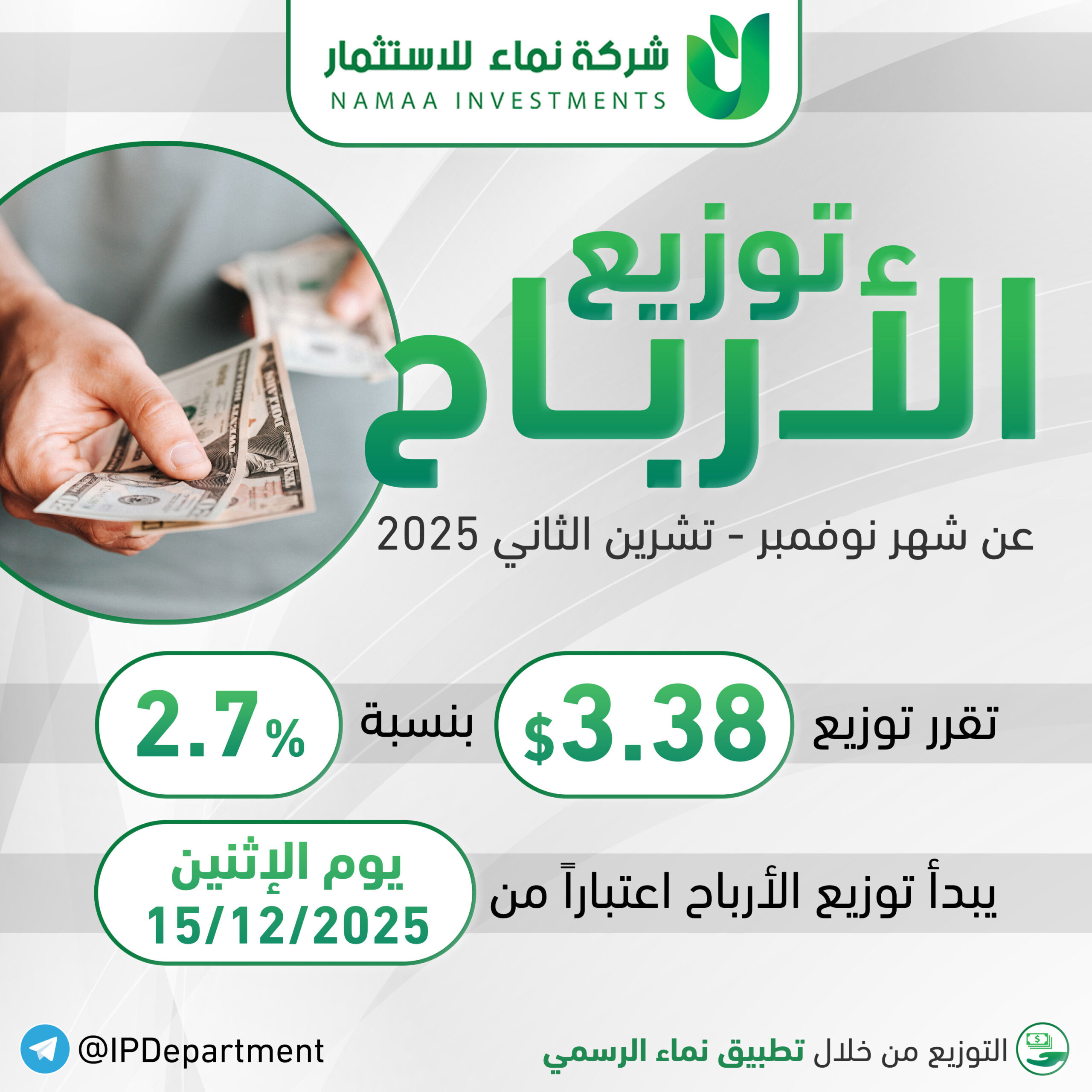 بفضلٍ من الله تعالى، بلغَ صافي أرباح شركة نـمـاء للاستثمار وشركاتِها التابعة عن شهر كانون الاول (ديسمبر) للعام الحالي 2025م نحو 1,465,200$ (مليون وأربعمائة وخمسة وستون ألفاً ومئتا دولار أمريكي). وعليه، قرَّر مجلسُ إدارةِ الشركة توزيع 2.75$ للسهمِ الواحدِ (دولاران أمريكيان وخمسة وسبعون سنتاً)، بنسبة 2.2%من القيمة الاسمية للسهم البالغة 125$.